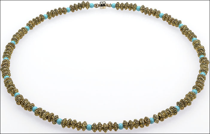 Egyptian necklace with corrogated roundels & rec. Turquoise beads