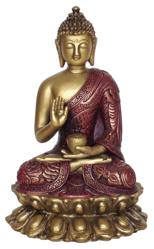 Gautama Buddha was born in 563 B.C. in northeast India. The Buddha was the son of the King of the Sakyas. Suddhodana, who ruled at Kapilavastu, on the border of Nepal. His mother was Queen Maya. He was named Siddhartha. He lived amidst the pleasures of palace life. After seeing a decrepid old man, an invalid, and an ascetic beggar, he learned of suffering and decided to embrace asceticism. Soon afterwards, at age 29, Siddhartha left the palace and his family and went to a hermitage where he became the monk Gautama, or, as he is still called, Sakyamuni (The ascetic of the Sakyas). One day, meditating under a sacred fig tree, he attained perfect illumination (Bodhi). He had become a Buddha. From there on he traveled and preached for 44 years what was to become one of the main religions of the world. He died at Kusinagara at age 80. Here Buddha is depicted in the earth-witness posture, with his right hand touching the Earth. As the Buddha drew near to his enlightenment experience, he was assailed by the forces of temptation (Mara). He remained steadfast, however, and reached down to call upon the Earth to witness his vow to be unmoved by any temptation. Thus, it is a gesture of determination, reflecting the immovable, unshakable aspect of meditation.