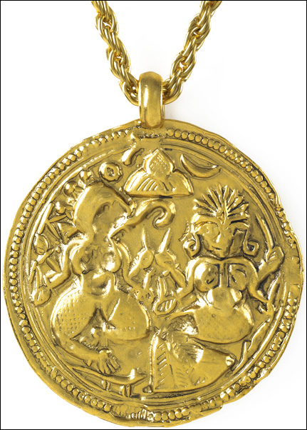 24 Karat antique gold-plate over pewter. 18″ Gold-plate chain.