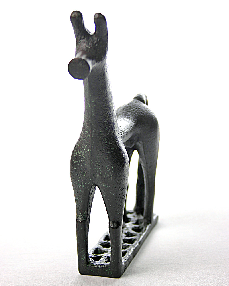 Around 900 BC a change in style took place in ancient Greek art. Both in decorations and in the art of sculpting geometric patterns emerged, which were very different from the pre-Hellenic style which was customary at the time. Painters began to decorate their pottery with stylized, sketched silhouettes, a style which soon was adopted by sculptors. The horse was suitable for this innovative geometric simplification. Every bronze foundry on the Greek continent developed their own variations, but the “pig’s snout”, the pointed ears and the triangular notches in the base of the sculpture remained characteristic. Sometimes the horses served as an ornament on vases, but usually they were sculptures on their own merit, which were often used as memorial statuettes.
